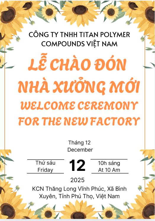Today, December 12, 2025, marks an extremely important milestone in our development history. Titan Polymer respectfully announces that we have officially commenced operations at Lot E-5, Thang Long Vinh Phuc Industrial Park, Binh Xuyen Commune, Phu Tho Province.